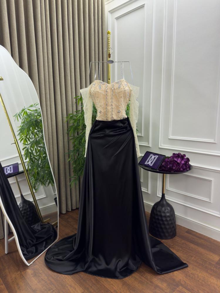 • التصميم: تنسدل التنورة بنعومة لتشكل ذيلاً بسيطاً يلامس الأرض، مما يضيف لمسة دراماتيكية وفخمة عند المشي.