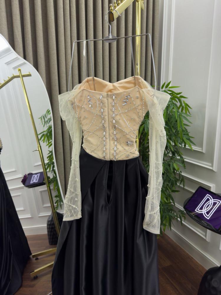 • الأكمام: أكمام طويلة من التول الشفاف، مزينة بتطريز متناثر يمتد على طول الذراعين، مما يمنح إطلالتكِ رقياً واحتشاماً أنيقاً.