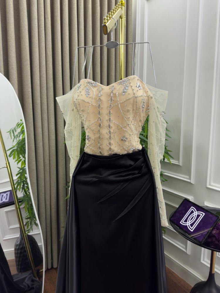 • التطريز: تصميم مُطرز يدوياً بالكامل بخليط من الكريستال الفضي البراق والخرز اللامع، مرصوف بدقة على شكل خطوط هندسية تبرز جمال الصدر والخصر وتضفي لمسة من الإشراق الملكي.